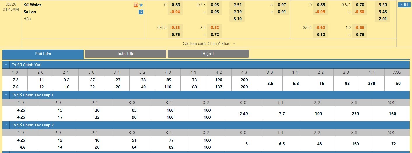 Tip kèo tỷ số hiệp 1: Wales 0-0 Ba Lan
