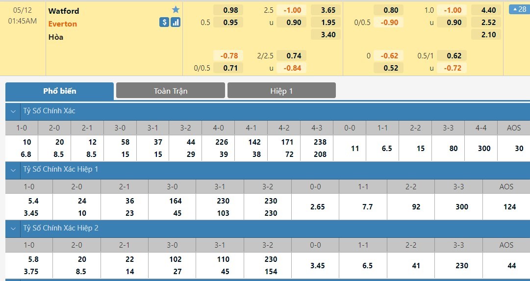 Tip kèo tỷ số hiệp 1: Watford 1-2 Everton