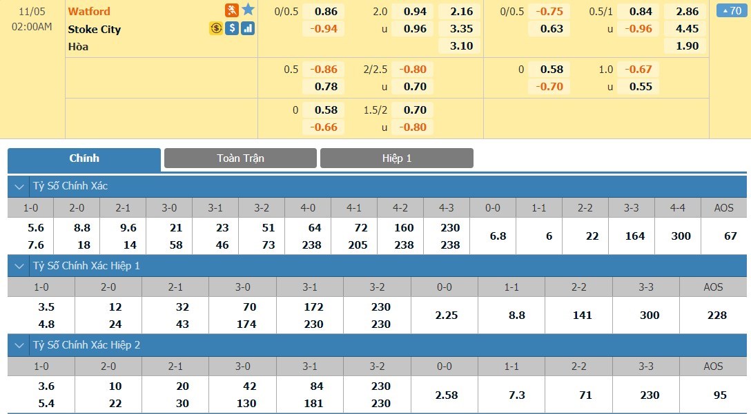 Tip kèo tỷ số hiệp 1: Watford 1-1 Stoke City