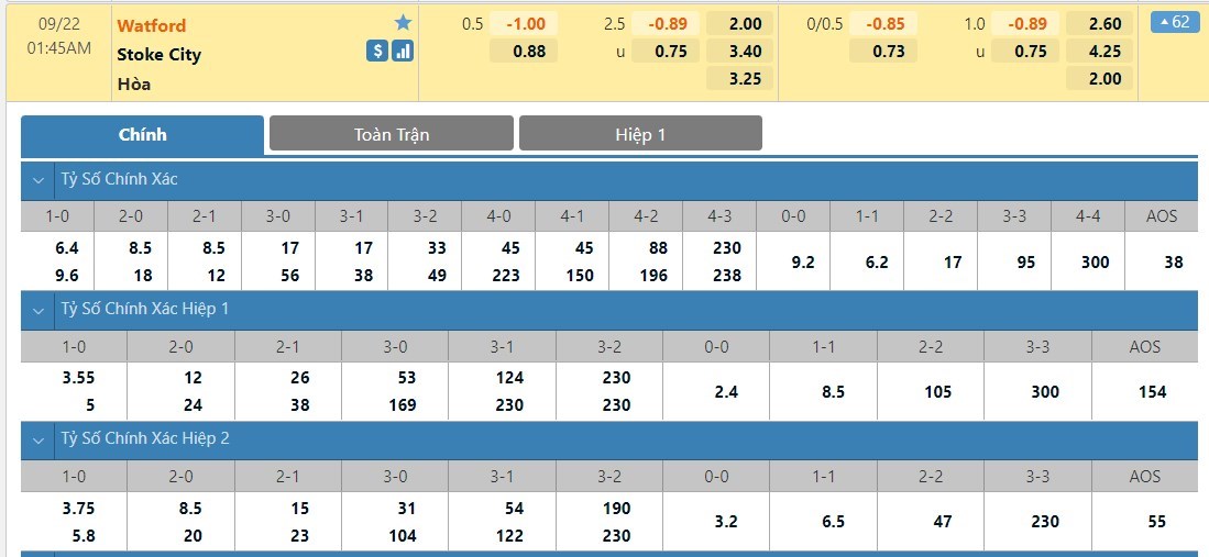 Watford được nhà cái dành cho vị thế cửa trên chấp tỷ lệ 1/2 trái trận này là hoàn toàn hợp lý. Mùa giải trước khi hai đội còn cùng chinh chiến tại giải hạng Nhất Anh, Watford đã đánh bại Stoke ở cả 2 lần gặp gỡ. Tinh thần của các cầu thủ Watford đang lên cao sau khi họ mới giành chiến thắng 3-1 trước Norwich tại vòng 5 giải Ngoại hạng Anh. Thống kê trong 10 cuộc đọ sức gần nhất giữa 2 đội, có 7 trận đấu kết thúc mà không xuất hiện nhiều hơn 2 bàn thắng. Thường các trận đấu ở mặt trận cúp Liên đoàn Anh không phải là nơi các đội ưu tiên dành sức lực tối đa. Vì lẽ đó, người hâm mộ cũng không nên quá kỳ vọng vào số lượng bàn thắng.