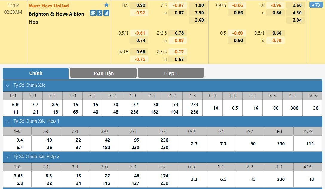 Tip kèo tỷ số hiệp 1: West Ham 0-0 Brighton
