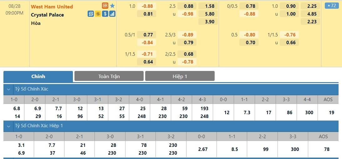 West Ham nhận được đánh giá cao từ phía đội ngũ chuyên môn. Nhà cái để họ chấp tỷ lệ -1 kèo đấu này. Đây là điều hợp lý khi West Ham nắm trong tay lợi thế sân bãi và phong độ hết sức ấn tượng. Chưa kể là trong lần gần nhất chạm mặt Crystal Palace thì West Ham đã đánh bại đối thủ với tỷ số 3-2.