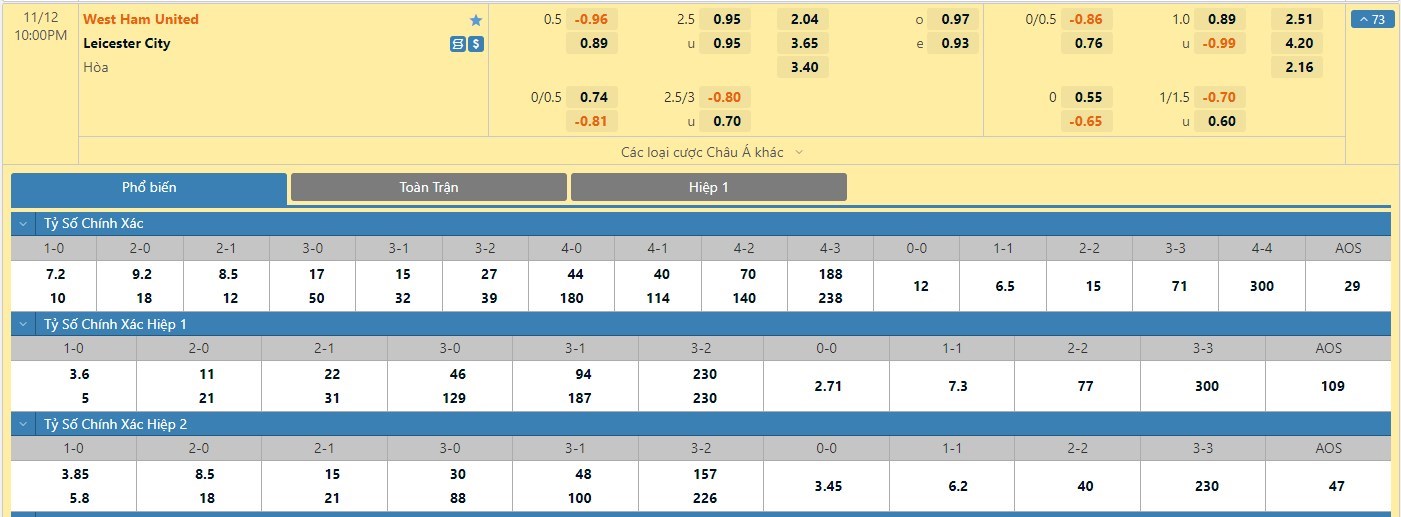 Trong 5 trận đấu gần nhất đôi bên đụng độ nhau trực tiếp, West Ham đã có 4 trận đấu mang về được cho mình ít nhất là 1 bàn thắng trong hiệp đấu đầu tiên. Còn với Leicester, đội bóng này chỉ có 2 lần làm được điều này trong 45 phút đầu tiên. Với tỷ lệ kèo hiệp 1 ở trận đấu này được đưa ra là West Ham chấp -1/4 trái thì người chơi nên tin tưởng vào đội khách trong hiệp 1 trận này.