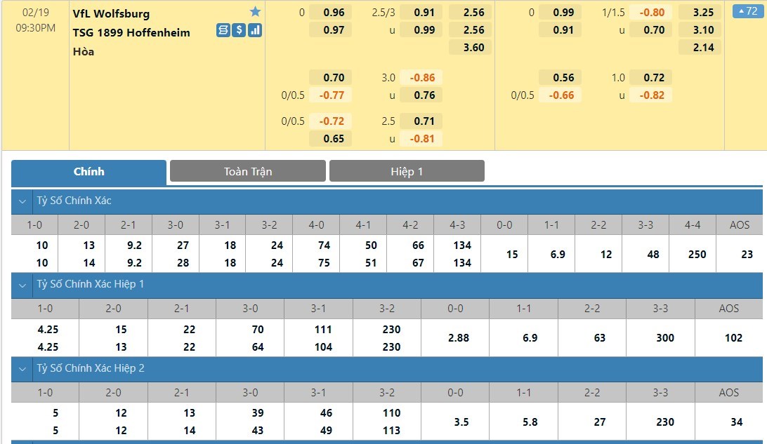 Tip kèo tỷ số hiệp 1: Wolfsburg 1-1 Hoffenheim