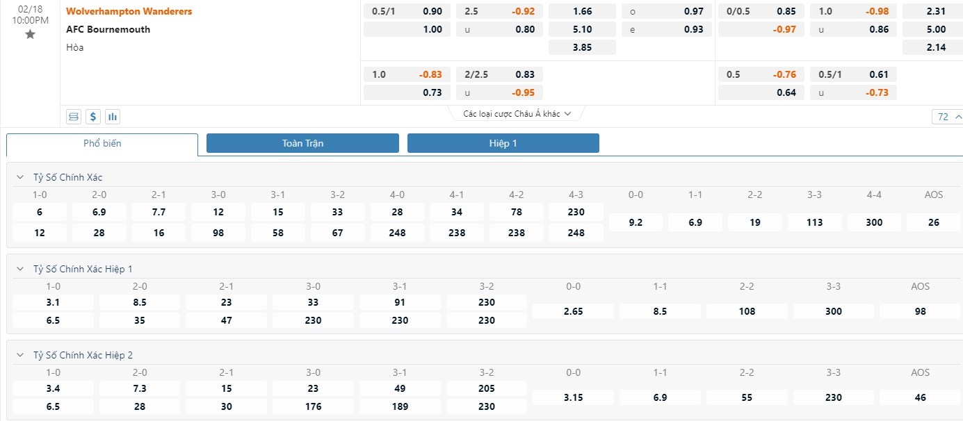 Lịch sử đối đầu đang chỉ ra ưu thế nghiêng về phía Wolverhampton. Trong 3 cuộc đọ sức gần nhất giữa hai đội, Wolverhampton giành 2 chiến thắng và 1 trận hòa. Không có gì khó hiểu khi Wolverhampton được nhà cái xếp ở thế cửa trên với mốc chấp -3/4 trái. Bên cạnh đó, sân nhà cũng là điểm tựa cho Bầy Sói. Thống kê chỉ ra rằng Wolverhampton đã giành được 3 chiến thắng trong 5 trận gần nhất chơi trên sân nhà Molineux. Hành quân xa nhà cũng là vấn đề đối với Bournemouth. Họ đã để thua trong cả 7 trận sân khách liên tiếp gần đây. Đáng chú ý là trong 7 trận đấu chơi xa nhà kể trên thì có tới 5 trận họ phải nhận từ 2 bàn thua trở lên.