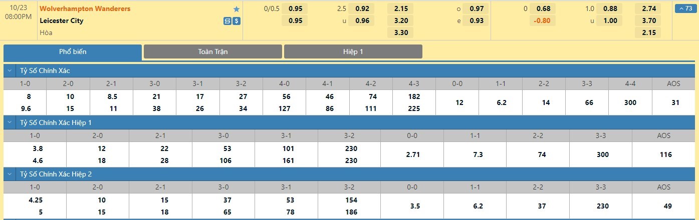 Trong 5 trận đấu gần nhất đôi bên đụng độ trực tiếp, nếu như Wolverhampton chỉ có 1 trận đấu mang về được cho mình ít nhất là 1 bàn thắng trong hiệp đấu đầu tiên thì Leicester đã có 3 lần làm được điều này trong 45 phút đầu tiên. Với tỷ lệ kèo hiệp 1 ở trận đấu này được đưa ra là đồng banh thì người chơi nên tin tưởng vào đội khách trận này.