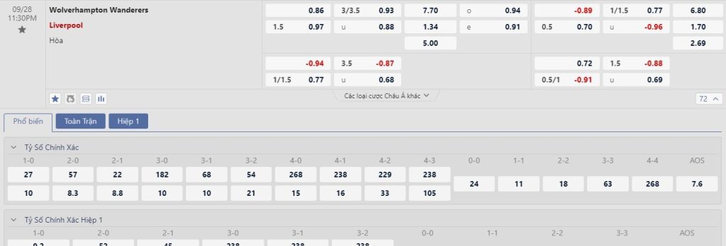 Tip kèo tỷ số hiệp 1: Wolves 0-1 Liverpool