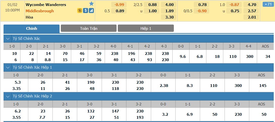 2 cuộc chạm trán trong lịch sử giữa 2 đội đều chỉ có 2 bàn thắng được ghi mỗi 90 phút. Các trận đấu có sự góp mặt của Wycombe có trung bình 2,1 bàn còn Middlesbrough là 2 ở mùa giải năm nay. Như vậy, trước mắt ta dự kiến sẽ là 1 kết quả xỉu nữa.