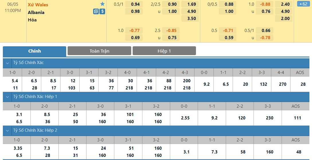 Tip kèo tỷ số hiệp 1: Xứ Wales 0-0 Albania