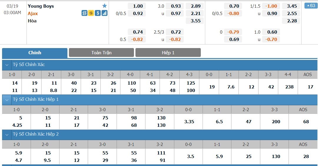 Tip kèo tỷ số hiệp 1: Young Boys 0-0 Ajax