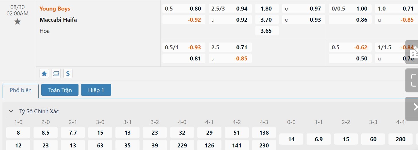 Tip kèo tỷ số hiệp 1: Young Boys 1-0 Maccabi Haifa