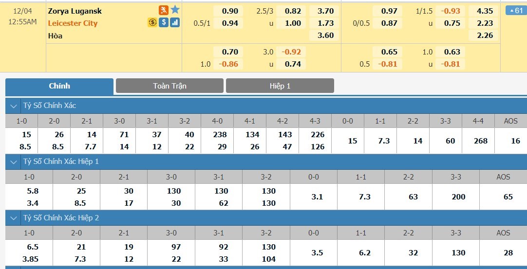 Tip kèo tỷ số hiệp 1: Zorya Luhansk 0-0 Leicester City