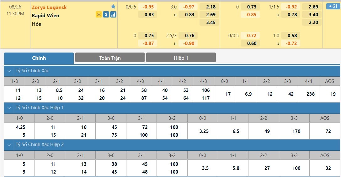 Với phong độ trái ngược mà 2 đội đã trình diễn trong quãng thời gian gần đây, việc lựa chọn đội khách Rapid Vienna hoàn toàn là cửa phù hợp hơn cả để đầu tư trong hiệp đấu đầu tiên cho người chơi. Trước khi bước vào trận lượt đi thì đa phần giới chuyên gia đã đánh giá Zorya rơi vào thế yếu hơn rất nhiều so với Rapid Vienna, và kết quả thậm chí còn ngoài mong đợi khi Rapid Vienna chơi áp đảo và nã vào lưới đối thủ tới 3 bàn. Ngược lại với Zorya, chủ nhà cần có sự thay đổi rất nhiều không chỉ từ phong độ cầu thủ mà còn cả chiến thuật của riêng họ để hy vọng về một kết quả lạc quan phía trước. Với kèo châu Á cả trận, nhà cái để chủ nhà chấp 0.25 trái cả trận. Tin rằng Zorya sẽ có một trận đấu tốt hơn so với trận lượt đi, dẫu vậy để lựa chọn đầu tư thì Rapid Vienna vẫn sẽ là lựa chọn an toàn hơn.